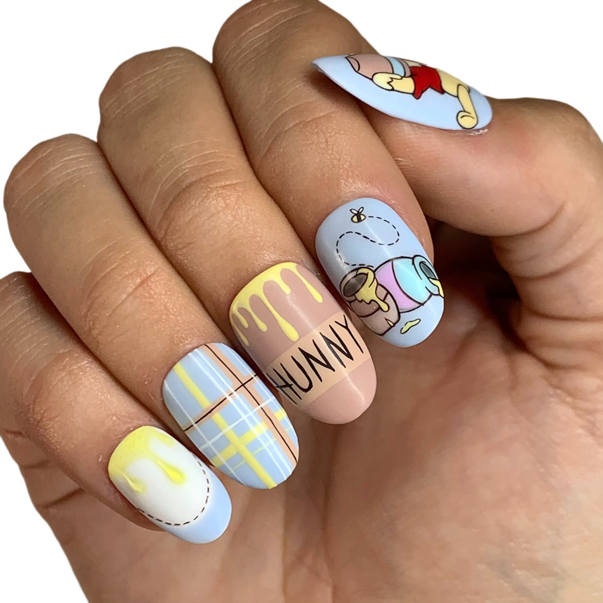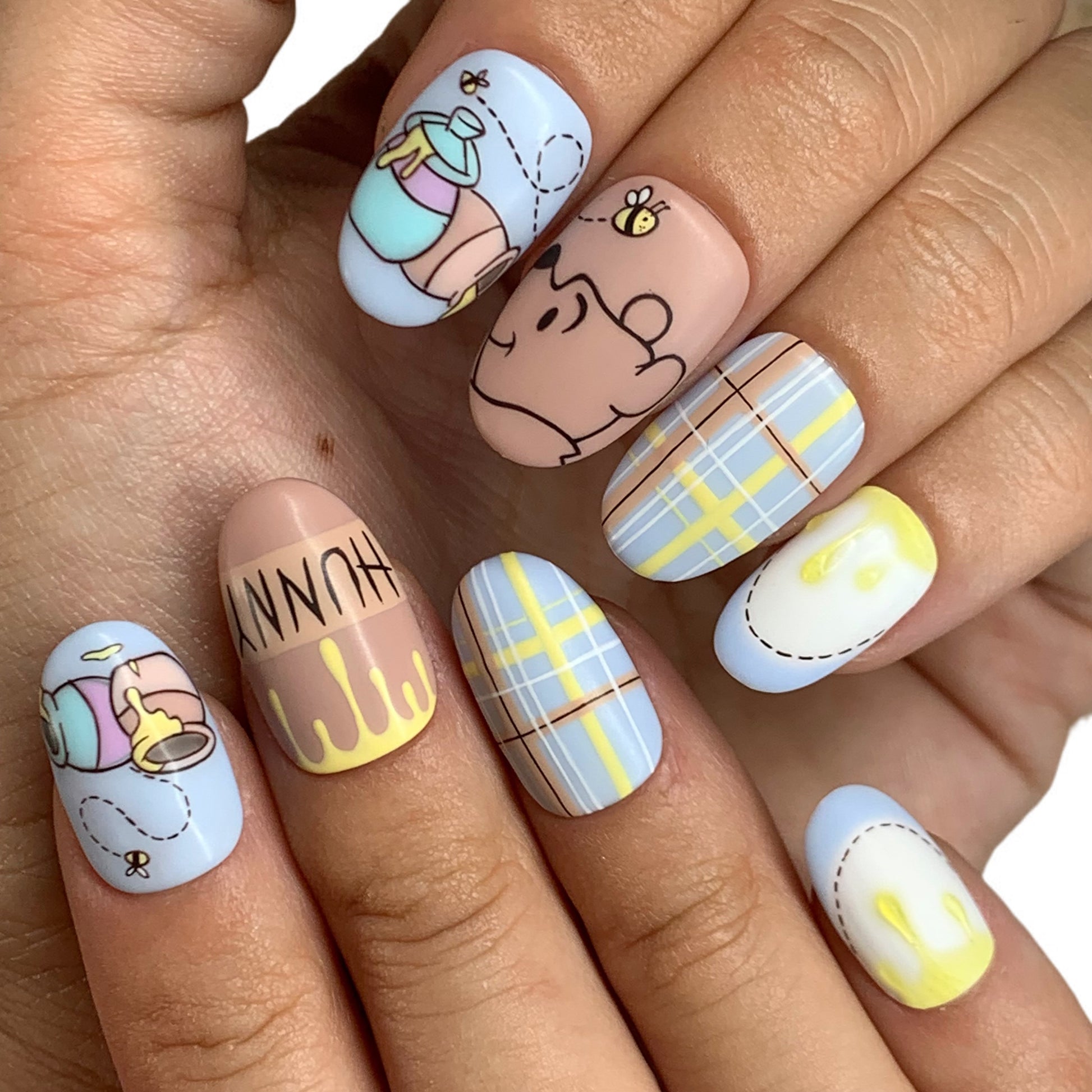 A soft, storybook-inspired design featuring pastel plaid, honey drips, and hand-painted character art. Crafted on Short Round Quickie Tips for a natural, comfy fit.