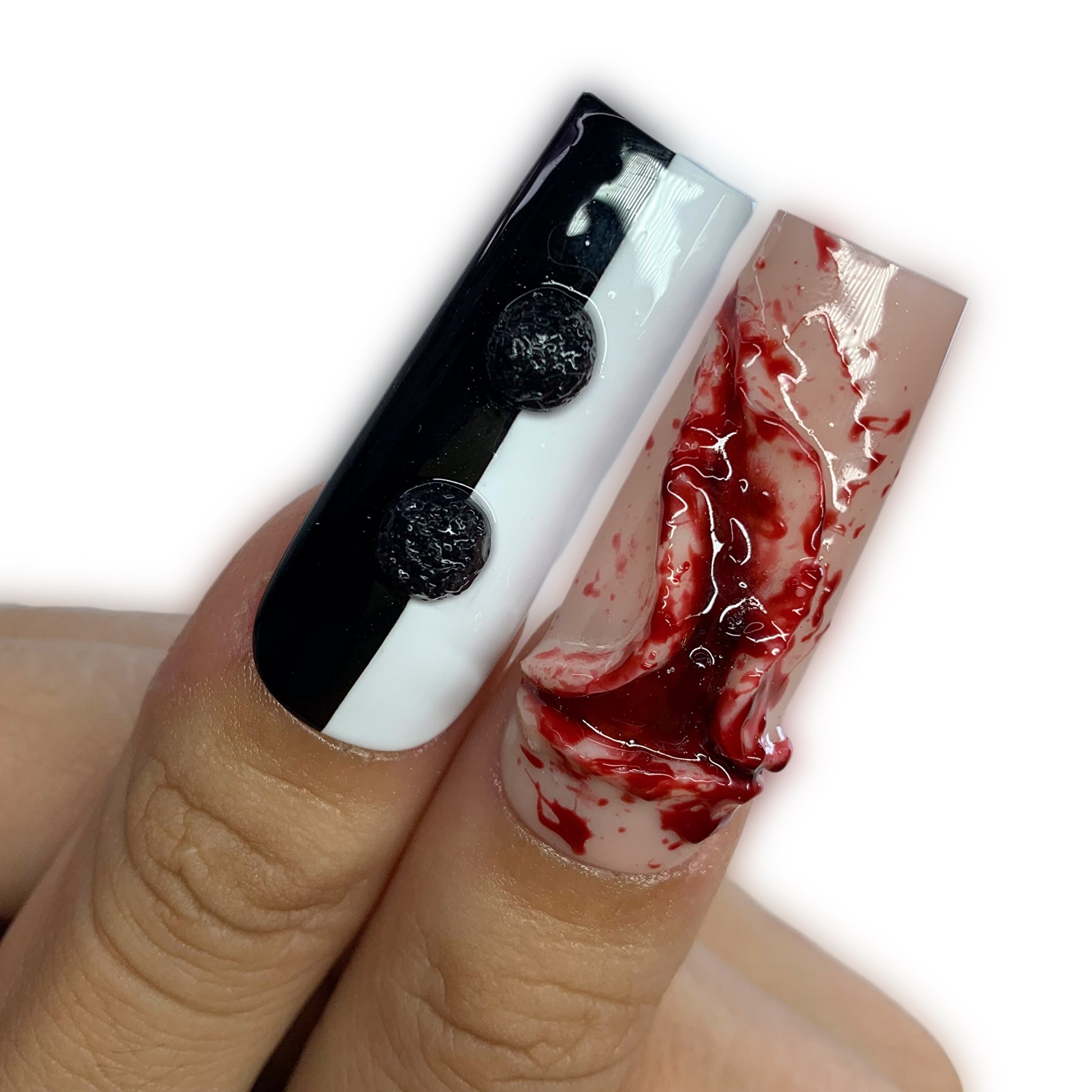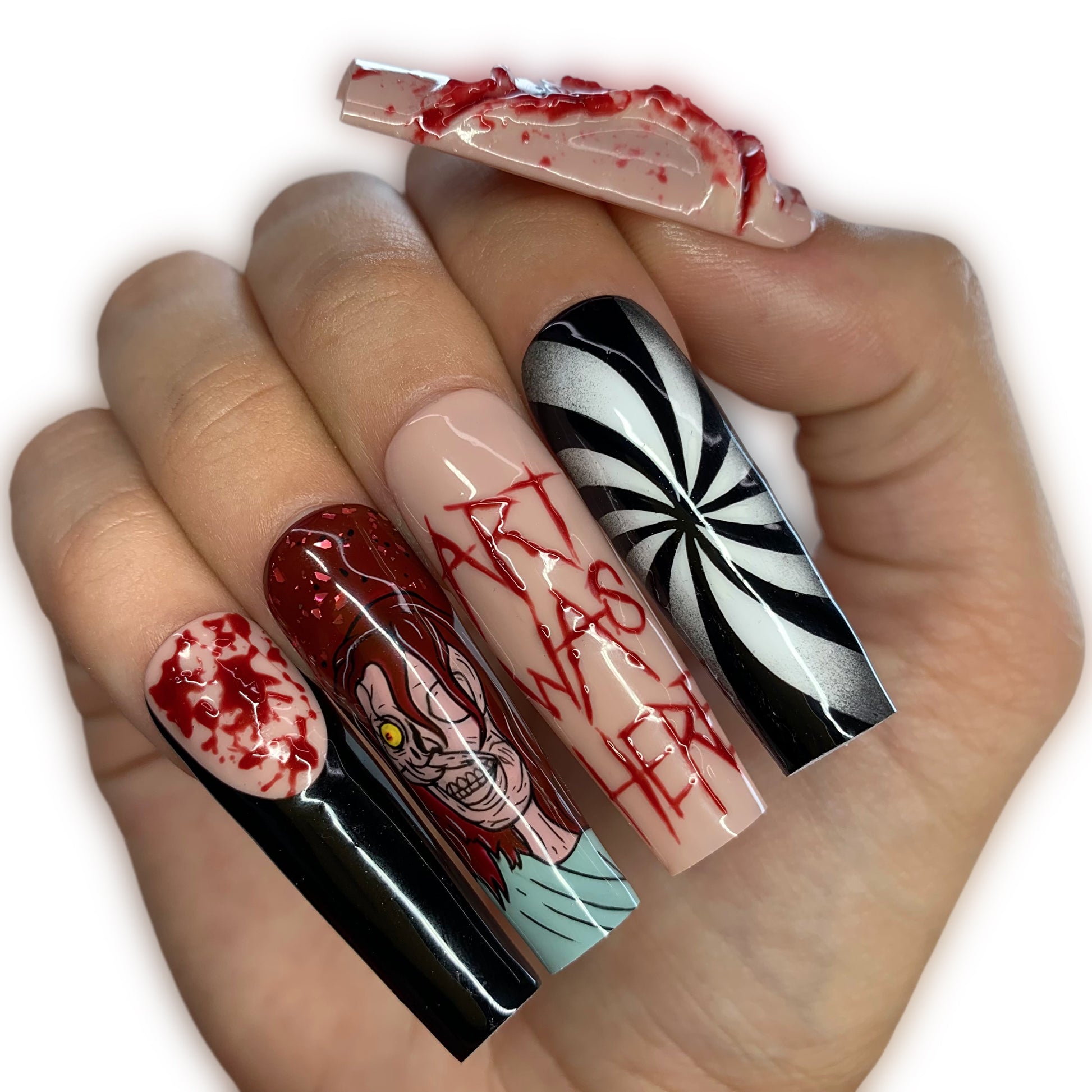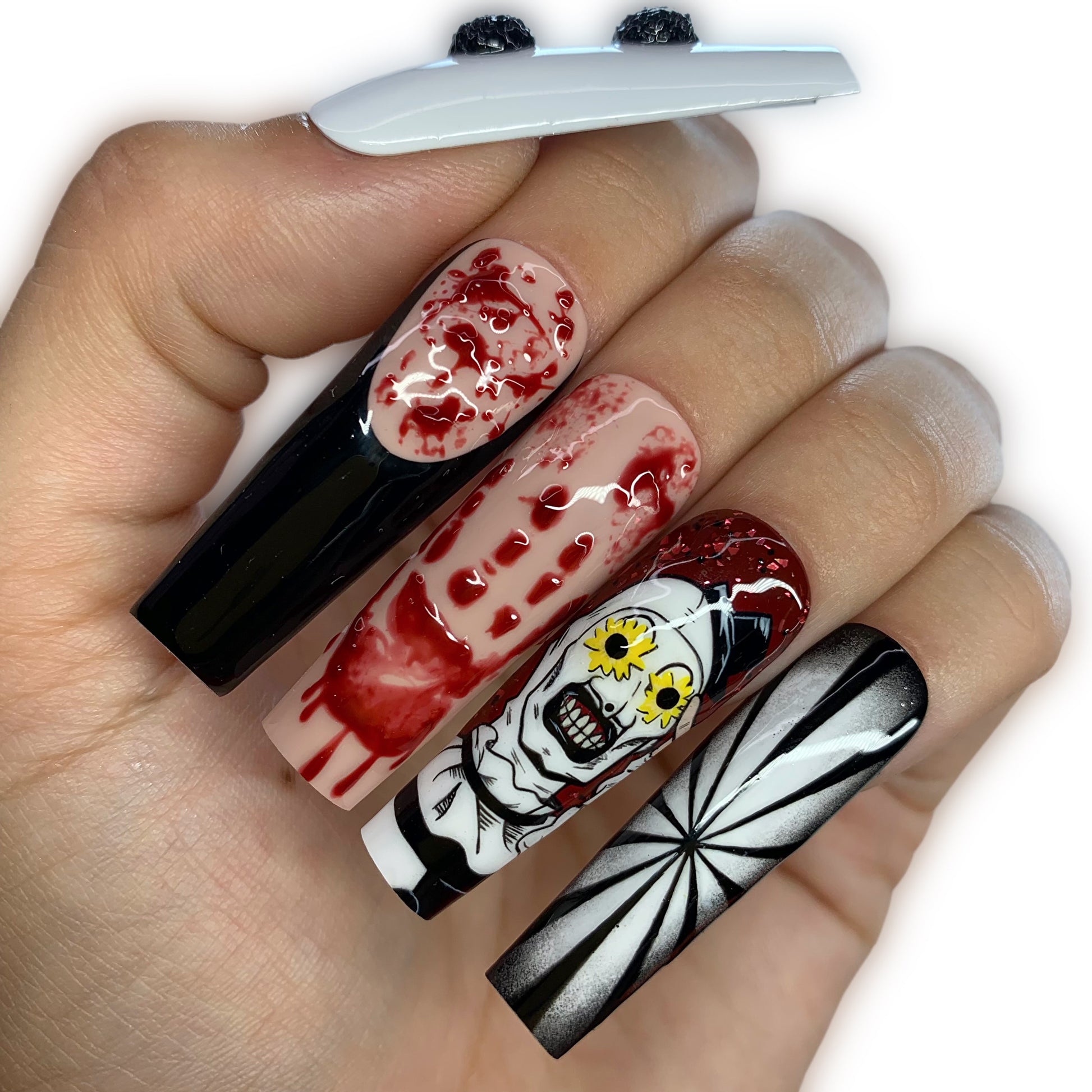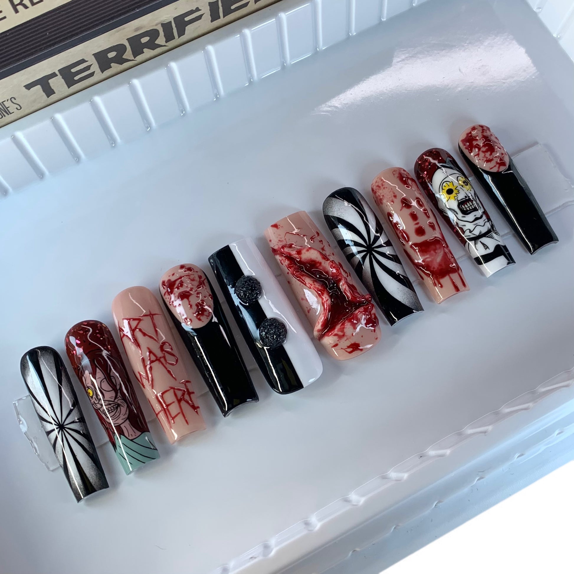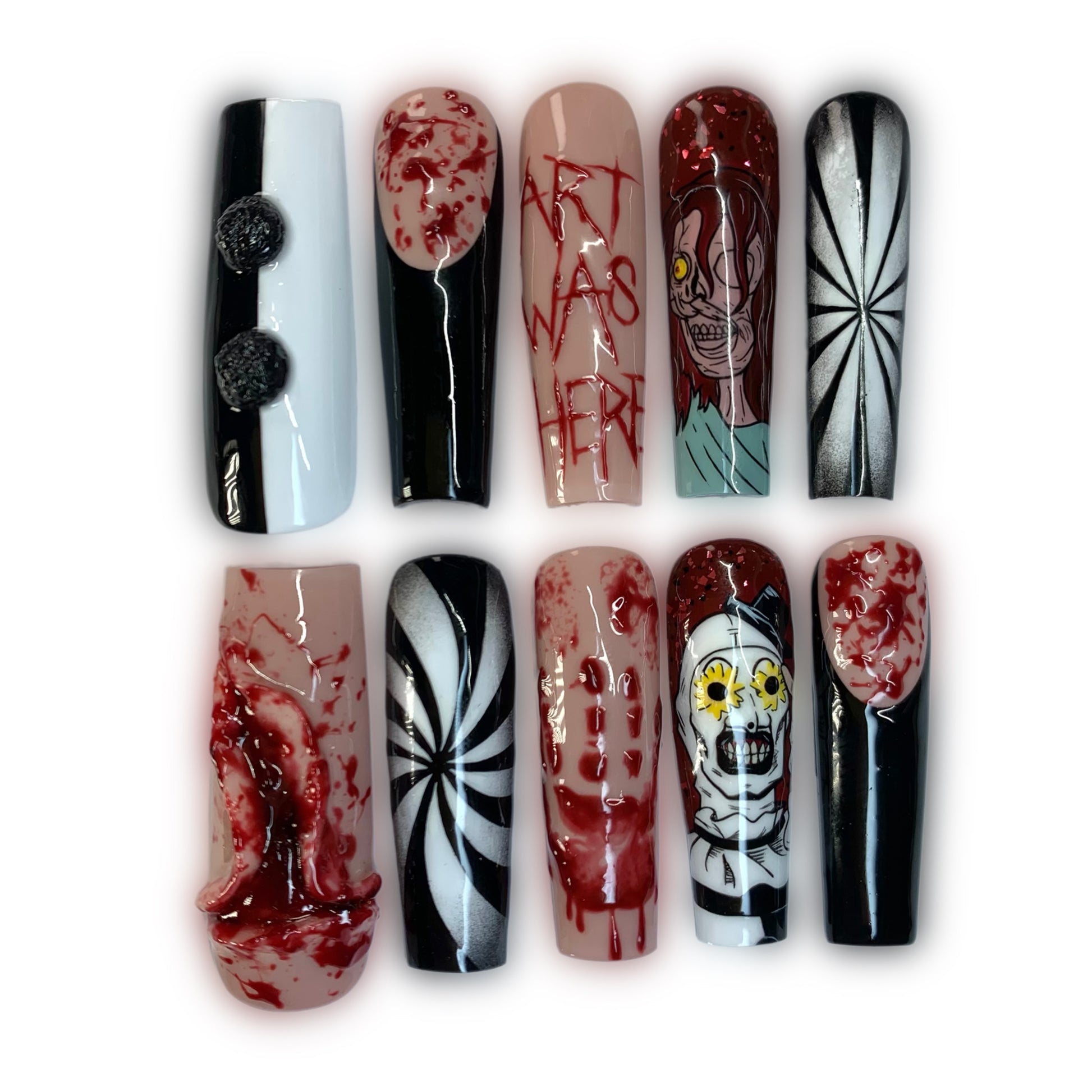 A 1-of-1 Medium Tapered Square Quickie Tips set featuring hand-painted Terrifier-inspired art, 3D blood SFX, spiral illusion accents, and bold black-and-white clown details. Crafted using NailzByDev products for a glossy, long-lasting finish.
